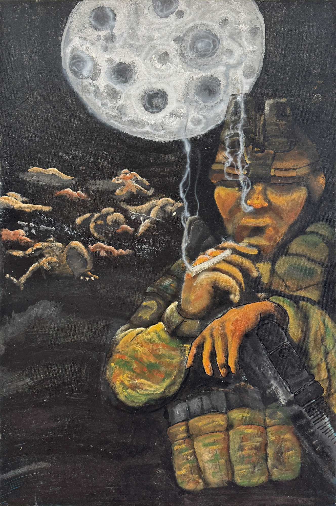 He began exploring art during the final years of his military service while undergoing treatment for combat-related injuries. What started as a personal outlet for unspeakable truths quickly evolved into a powerful form of expression. His work was first recognized during a therapeutic art workshop by influential figures including Ashy Palliparambil (then USO, now Mission Belonging Program Manager), Lovella Calica (Founder of Warrior Writers), Eli Wright (Frontline Arts Instructor), and Seema Reza (Founder of Mission Belonging).